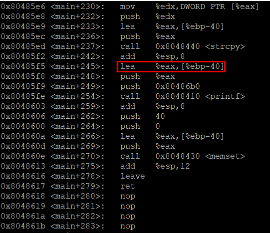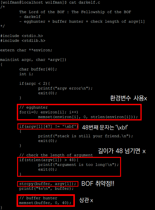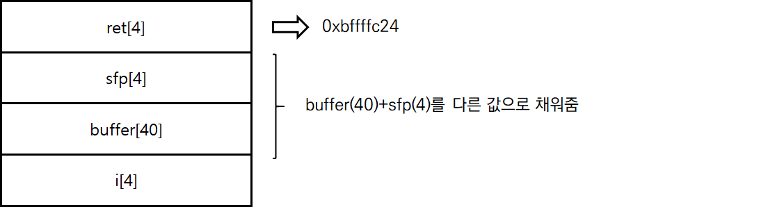 - argv[1]의 길이가 48까지만 허용되므로 buffer(40) + sfp(4) + ret(4) =48만큼만 들어갈 수 있다